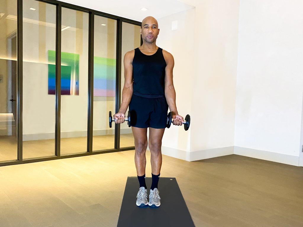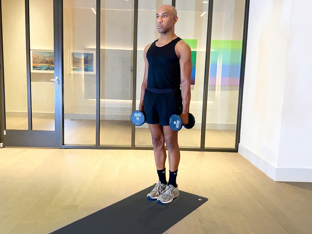 1. Stand by holding a dumbbell in each hand with your arms hanging by your sides, and brace your core. Pull your belly button to your spine.